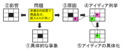 ①具体的な事象 ②影響 ③原因 ④アイディア列挙 ⑤アイディアの具体化